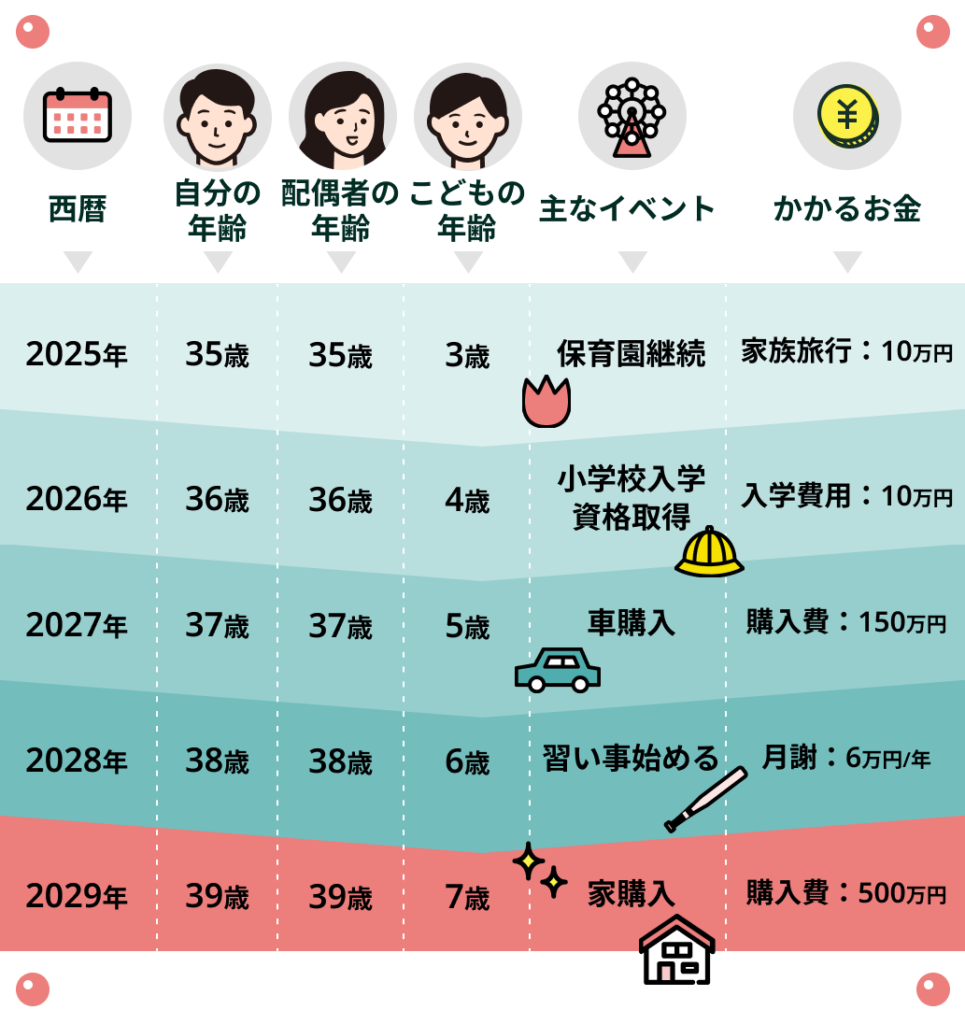 これからの生活で、何年後にどんな支出があるかをまとめた表のこと。