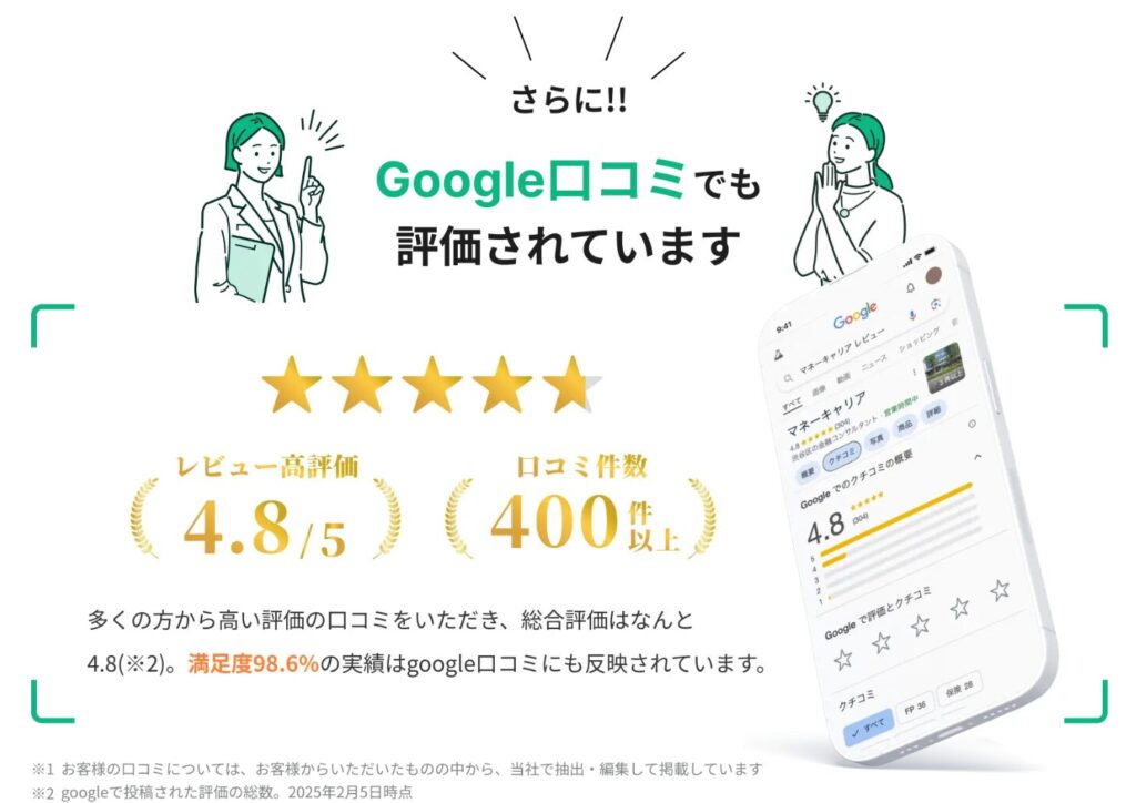 実際に、マネーキャリアで相談した人の満足度は高く、98%以上が「相談してよかった」と回答するなど、口コミでも高く評価されています🙋♀️
