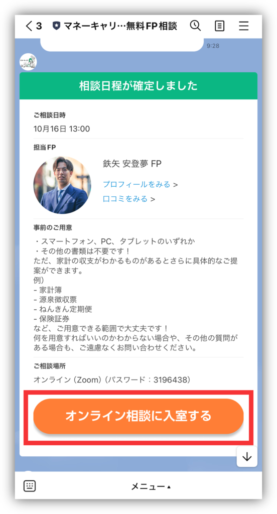 相談日時や担当FPさんに問題がなければ、当日は「オンライン相談に入室する」をタップして相談を受けてください!