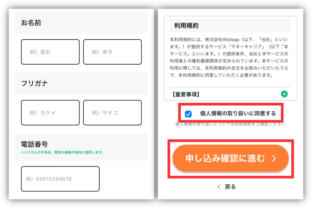 その後、利用規約の内容を確認して、問題なければ「個人情報の取り扱いに同意する」にチェックを入れてください。