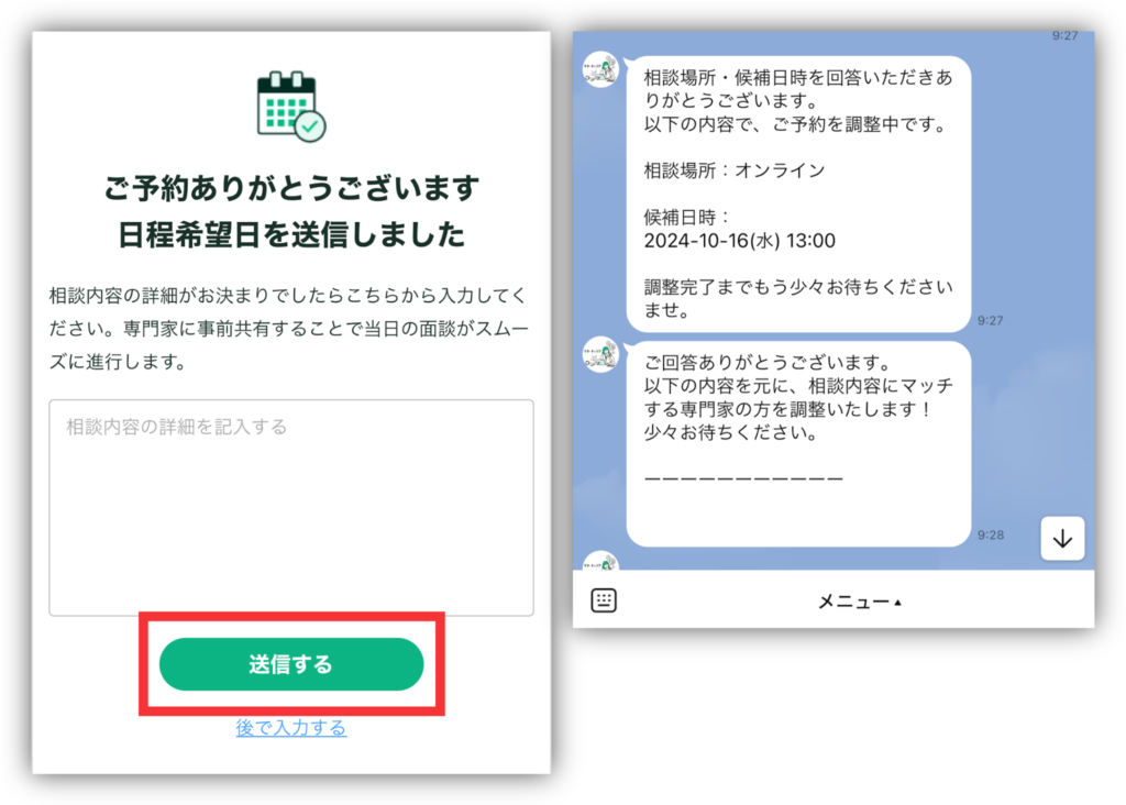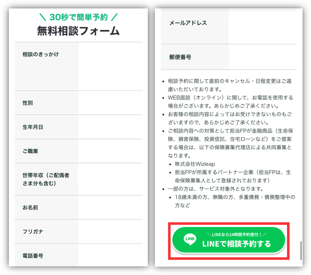 最後に、入力内容に間違いがないか確認したら「LINEで相談予約する」をタップします。
