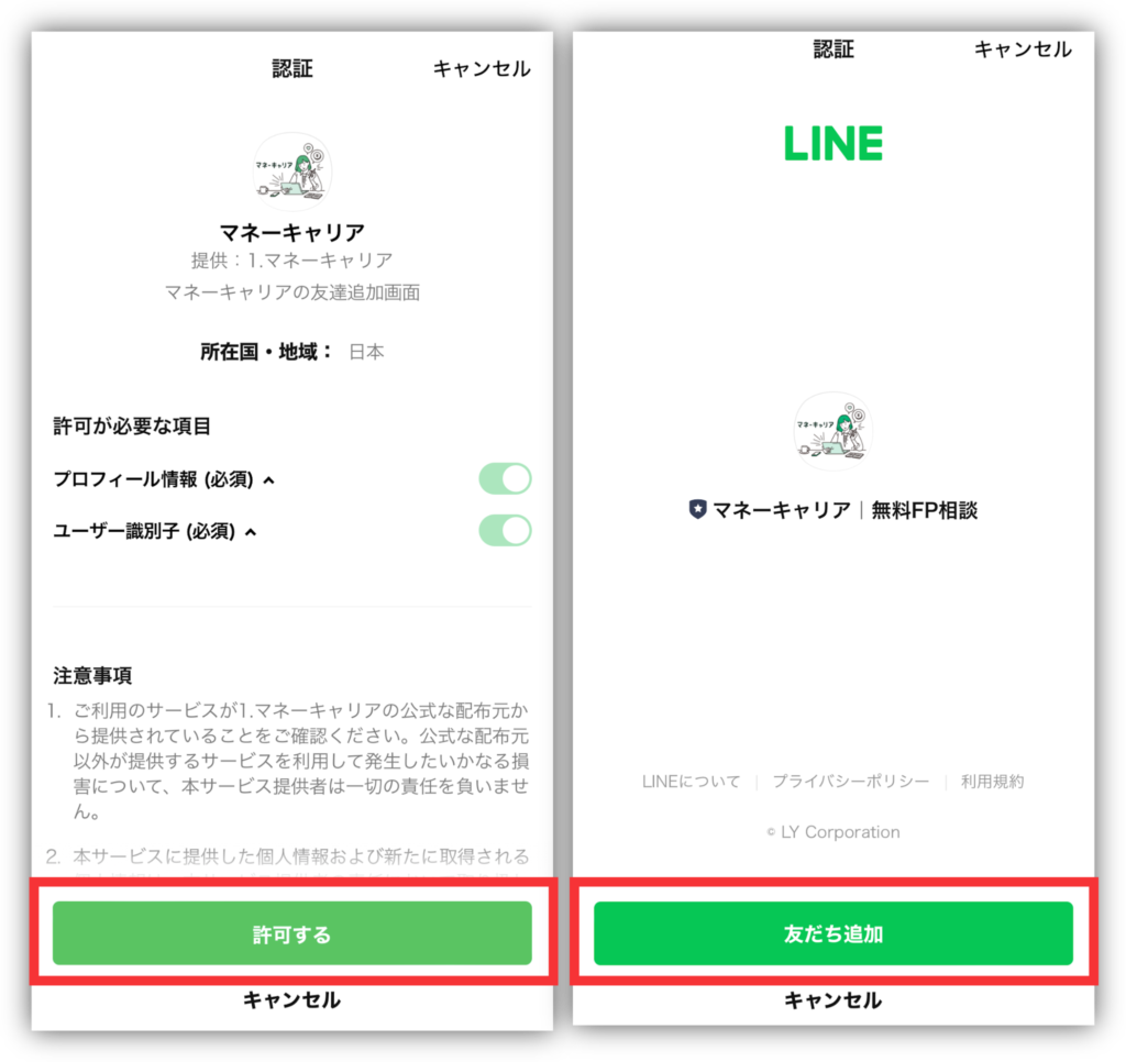 LINEアプリが開いて認証画面が表示されたら、注意事項を確認して「許可する」をタップします。