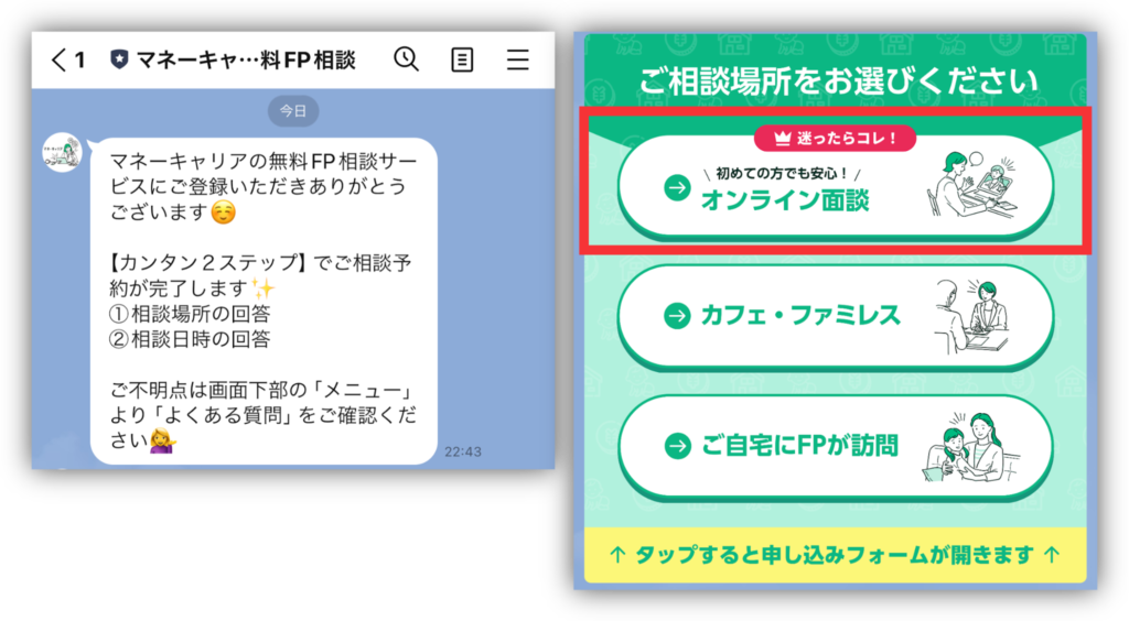 公式LINEの登録が完了するとメッセージが届くので、相談場所を決めましょう!