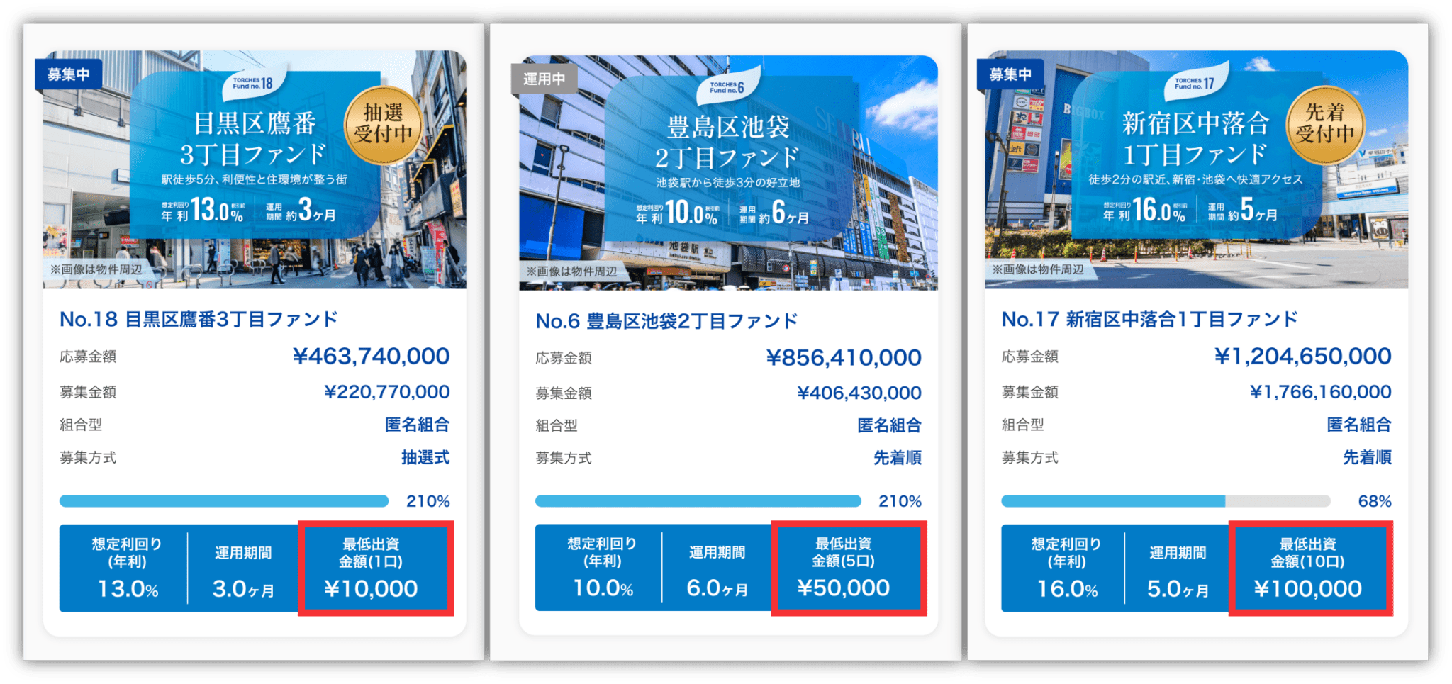 以下のように、最低の投資額は1万円(1口)、5万円(5口)、10万円(10口)と、案件によって異なります!