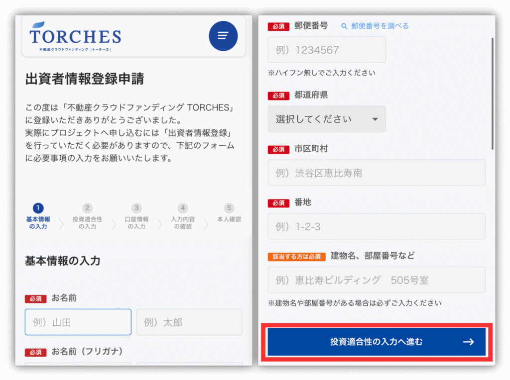 お名前から順に入力していき、入力が終わったら「投資適合性の入力へ進む」をタップしてください😊