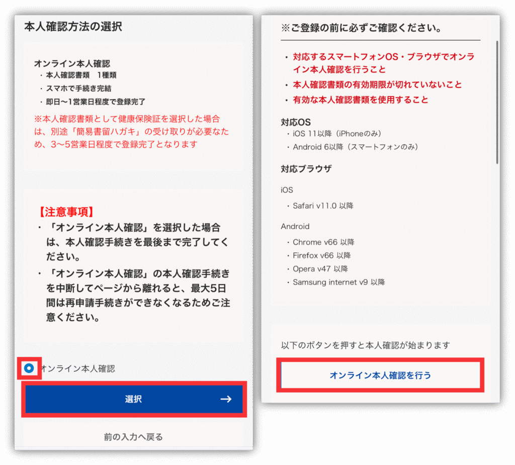 本人確認方法は「オンライン本人確認」を選んだら、「選択」をタップしてください!