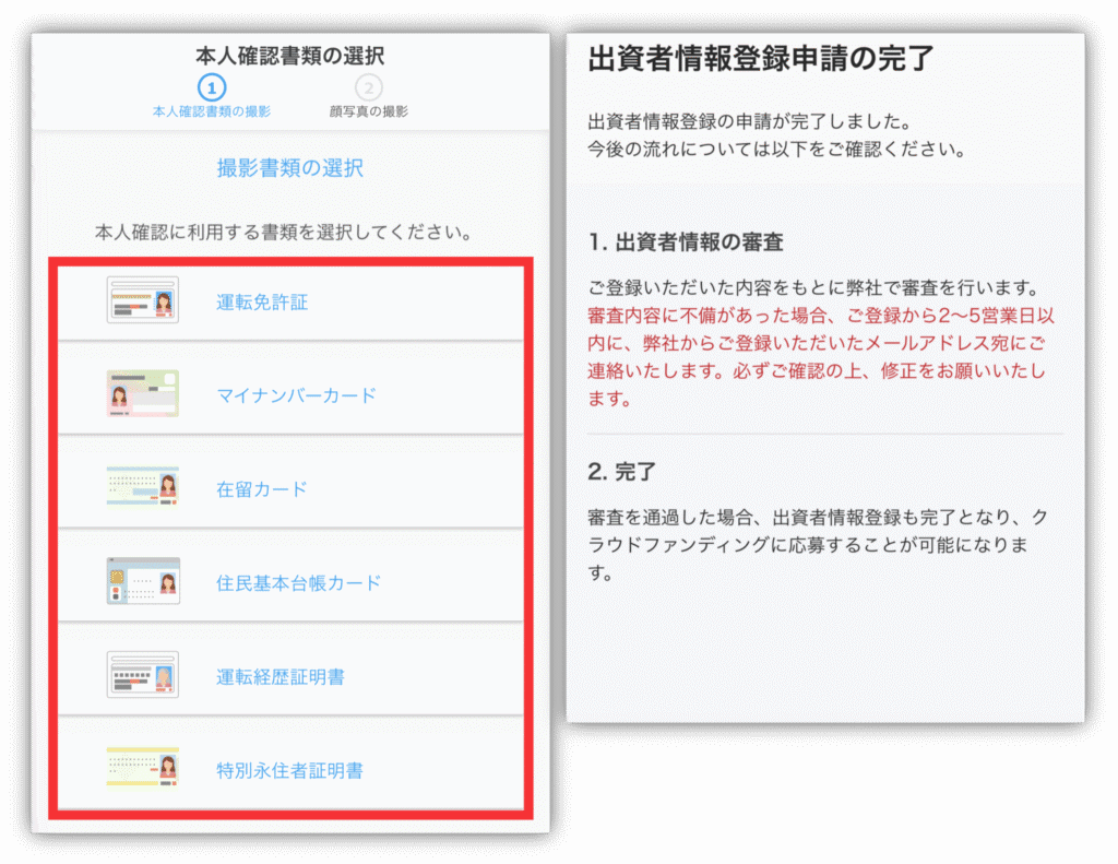 すべての撮影が終わると「出資者情報登録申請の完了」が表示されるので、審査が終わるまで少し待ってくださいね☺️