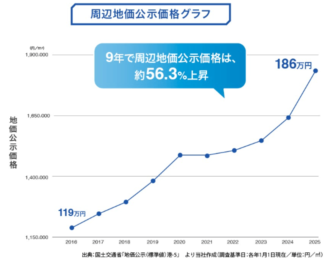実際に、これだけ魅力的なエリアであることから、物件周辺の地価は過去9年間で約56%も上昇中!