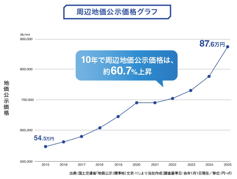 実際に本物件の周辺の地価は、10年で1.6倍以上に上昇中✊