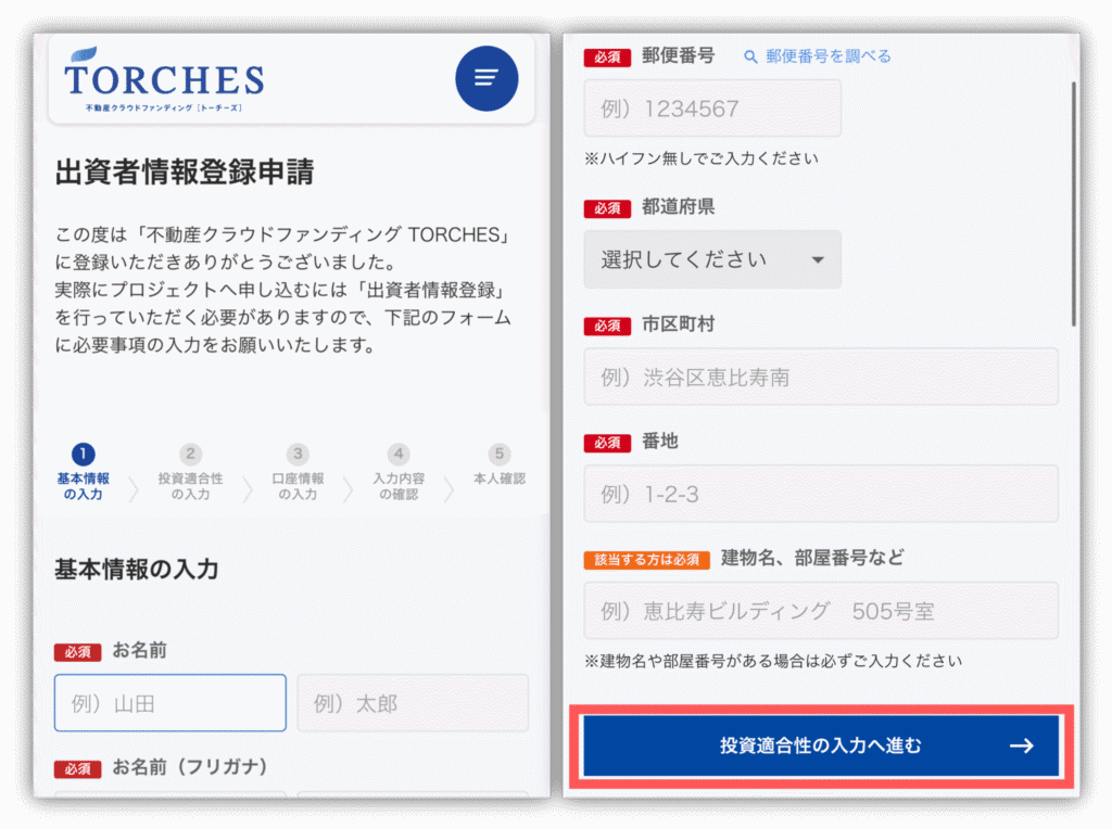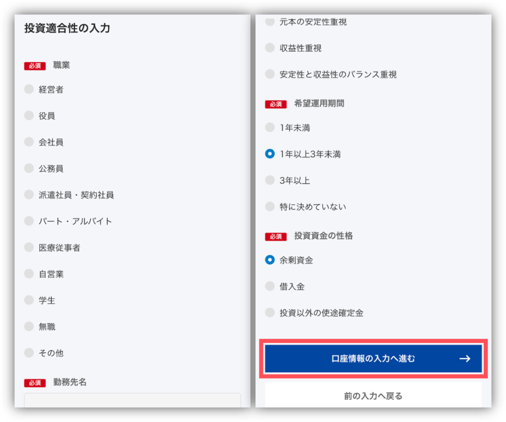 お名前から順に入力していき、入力が終わったら「投資適合性の入力へ進む」をタップしてください😊