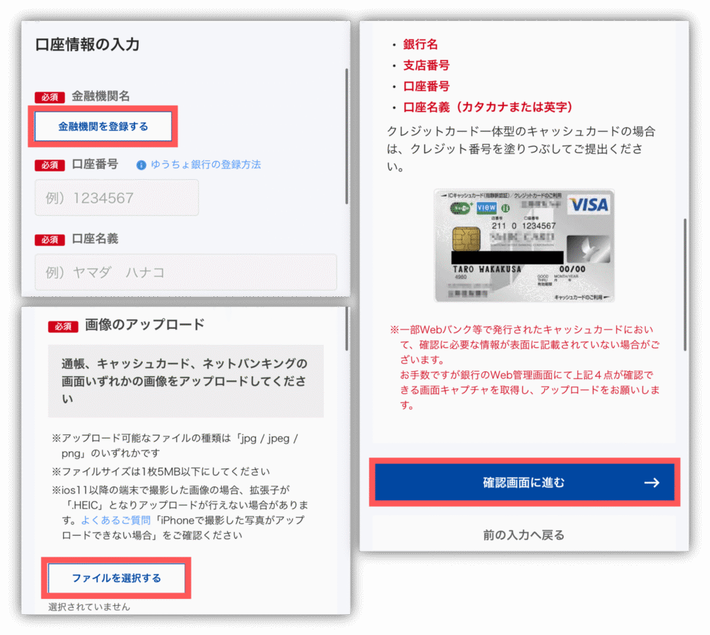 普段よく使う銀行情報を入れていき、証明画像をアップロードしたら「確認画面に進む」をタップしてください!