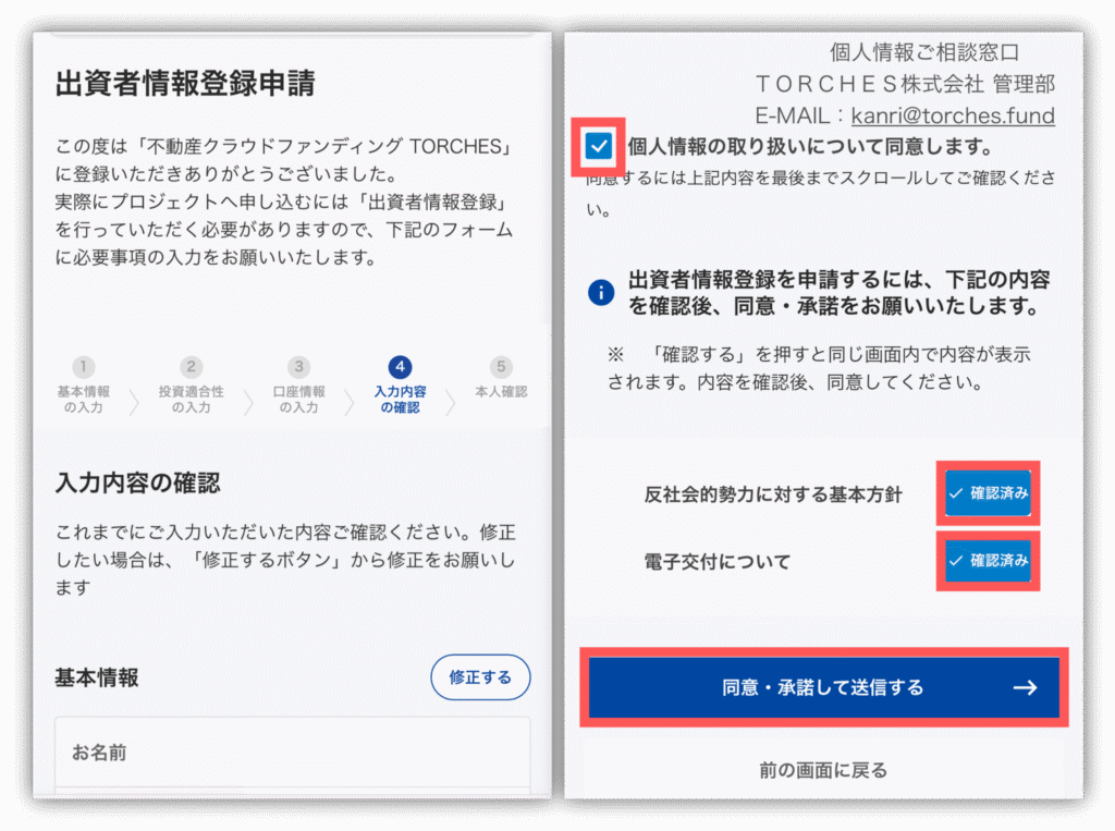 問題がなければ、2つの書類を確認し「同意・承諾して送信する」をタップします!