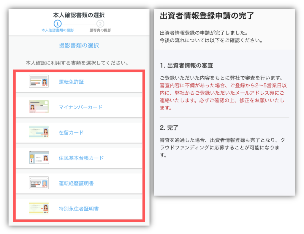 すべての撮影が終わると「出資者情報登録申請の完了」が表示されるので、審査が終わるまで少し待ってくださいね☺️